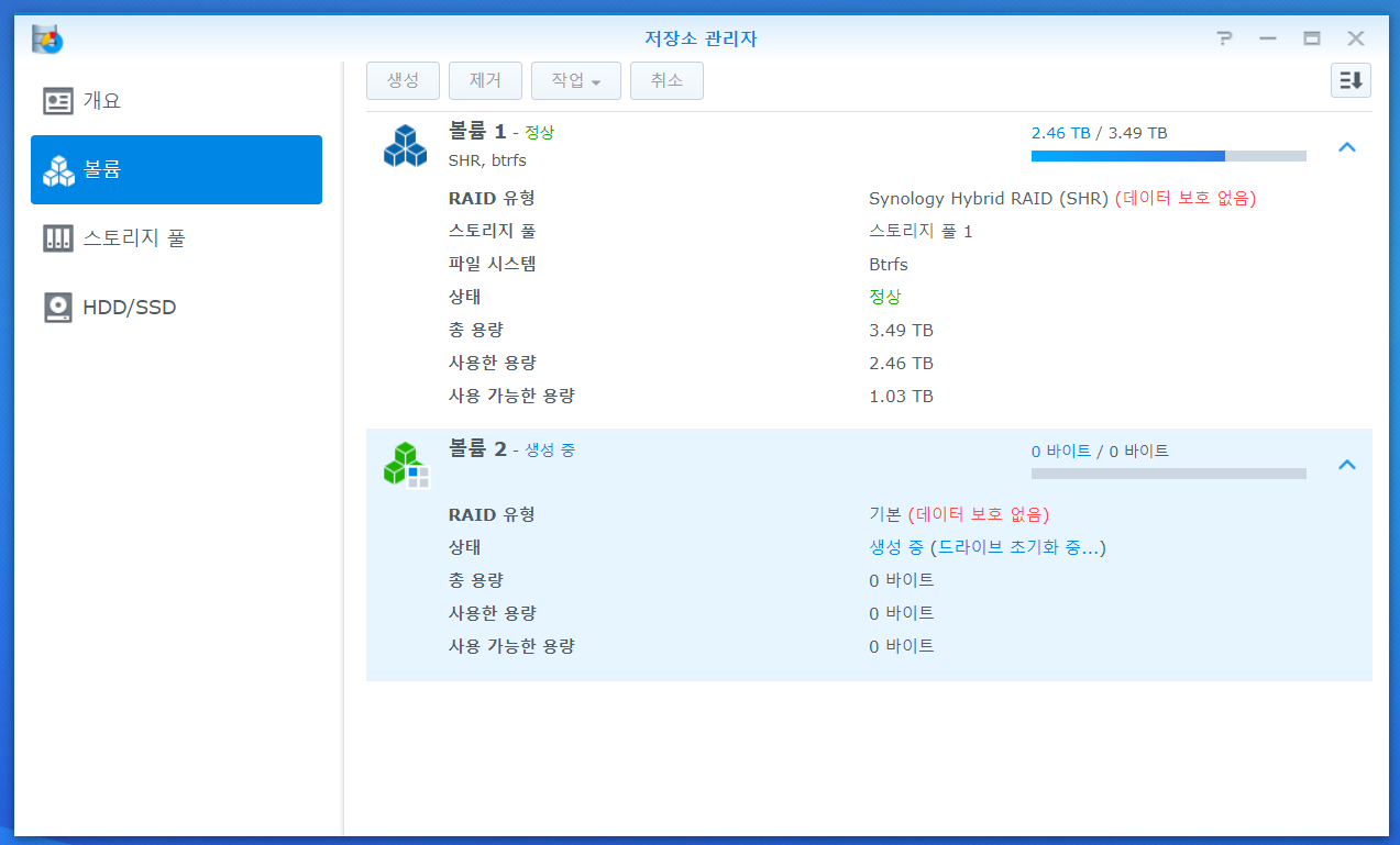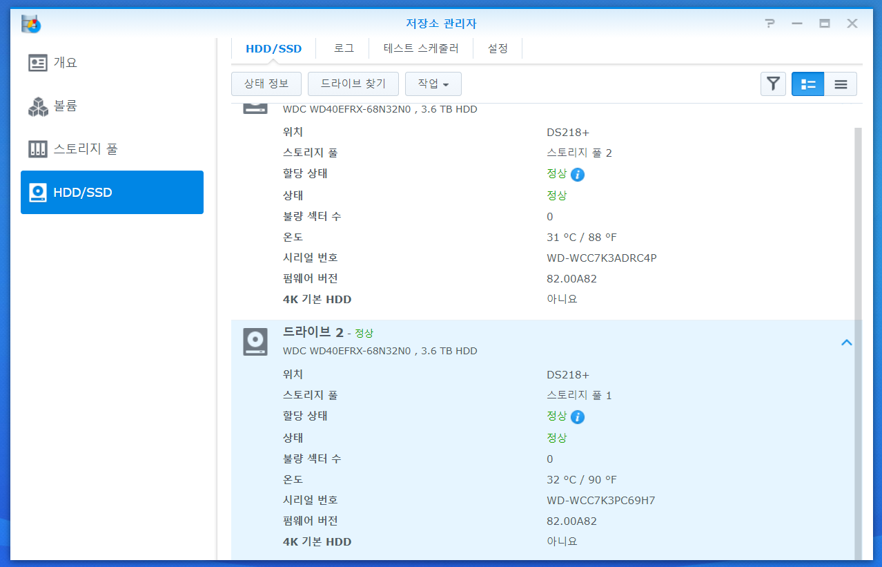생성이 완료되면 [HDD/SSD] 메뉴에서 드라이브2 할당상태가 정상으로 표시됩니다.