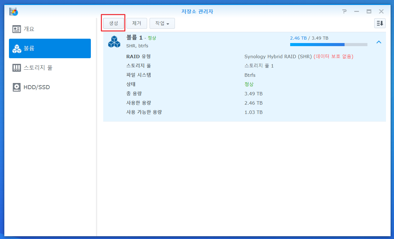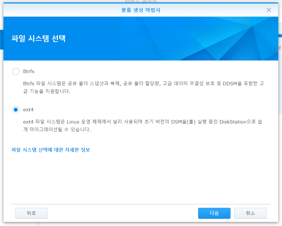 파일 시스템은 추가 볼륨이기 때문에 저는 ext4로 선택하였습니다. DSM의 특정 기능을 사용하려면 Btrfs를 선택해야 하지만 사실 아무거나 선택하셔도 무방합니다.