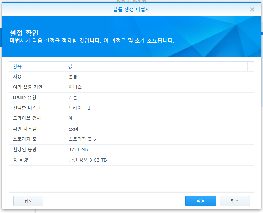 설정 확인 [적용]을 누르면 볼륨이 추가를 완료 할 수 있습니다.