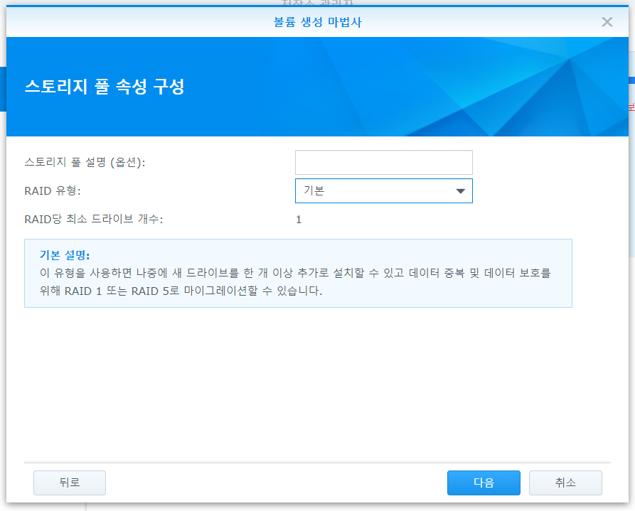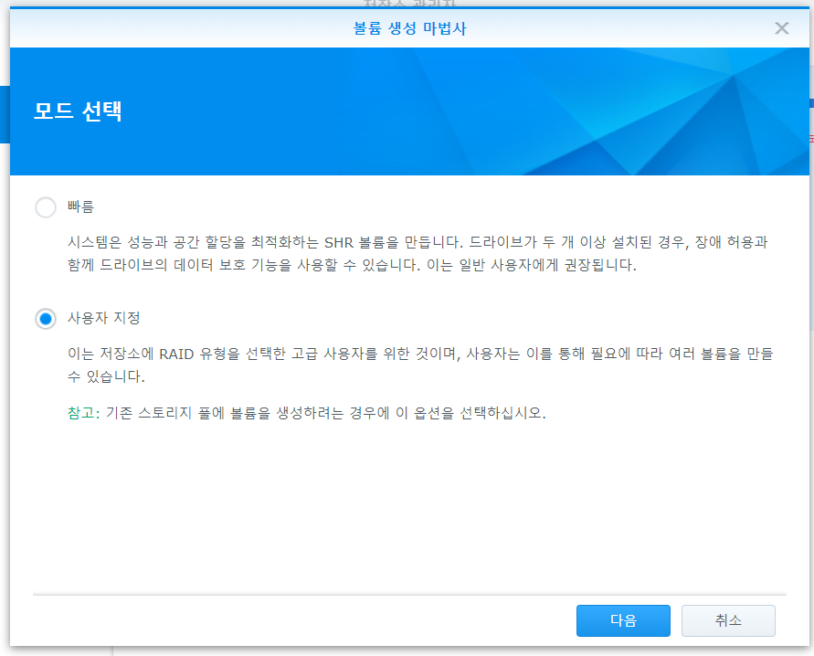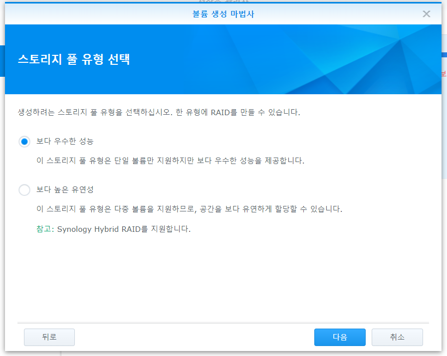 RAID를 구성하여 사용하려면 [보다 높은 유연성]을 선택하면 됩니다. RAID는 여러개의 하드 디스크를 한 개처럼 사용하는 방식으로 중요한 데이터 보관에 용이한 방법입니다.