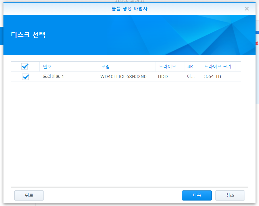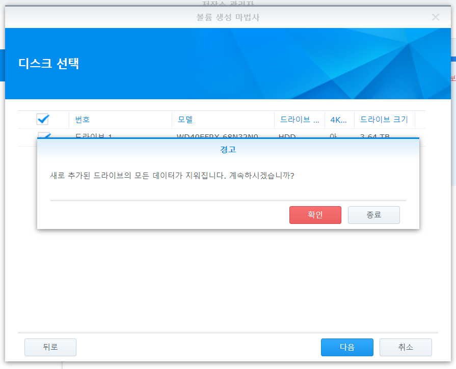디스크 선택에서는 추가한 드라이브를 체크한 후 [다음 > 확인]을 클릭합니다.