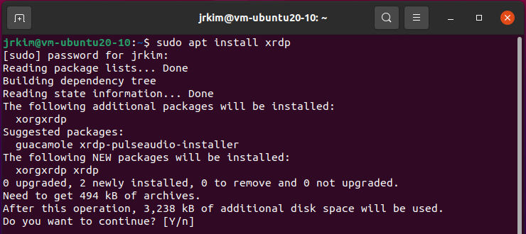 터미널에서 apt 명령으로 xrdp를 설치합니다.