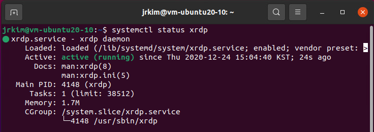 xrdp 패키지가 설치되어 있는지 확인합니다. 풀패키지를 설치하지 않았다면 xrdp가 설치되어 있지 않습니다.