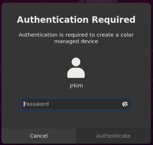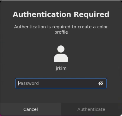 root 패스워드를 입력하면 인증이 되고 창이 없어집니다. 그런데 재로그인 시 Authentication is required to create a color profile 메시지와 함께 인증을 요구하는 창이 뜨고 인증을 해도 창이 없어지지 않는 현상이 발생합니다.