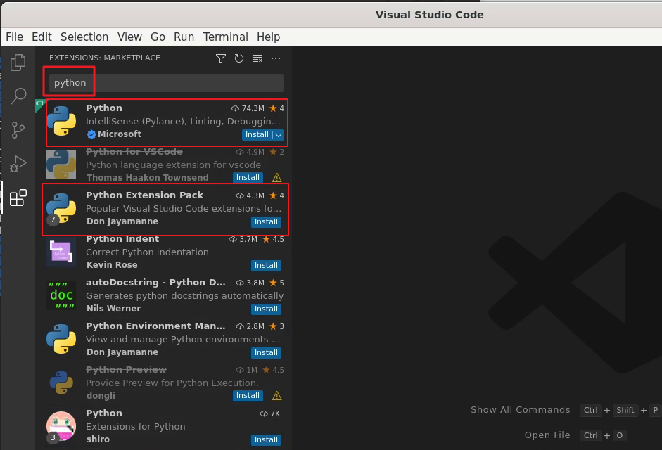 Extension 메뉴에 들어가서 검색창에 python을 입력합니다.