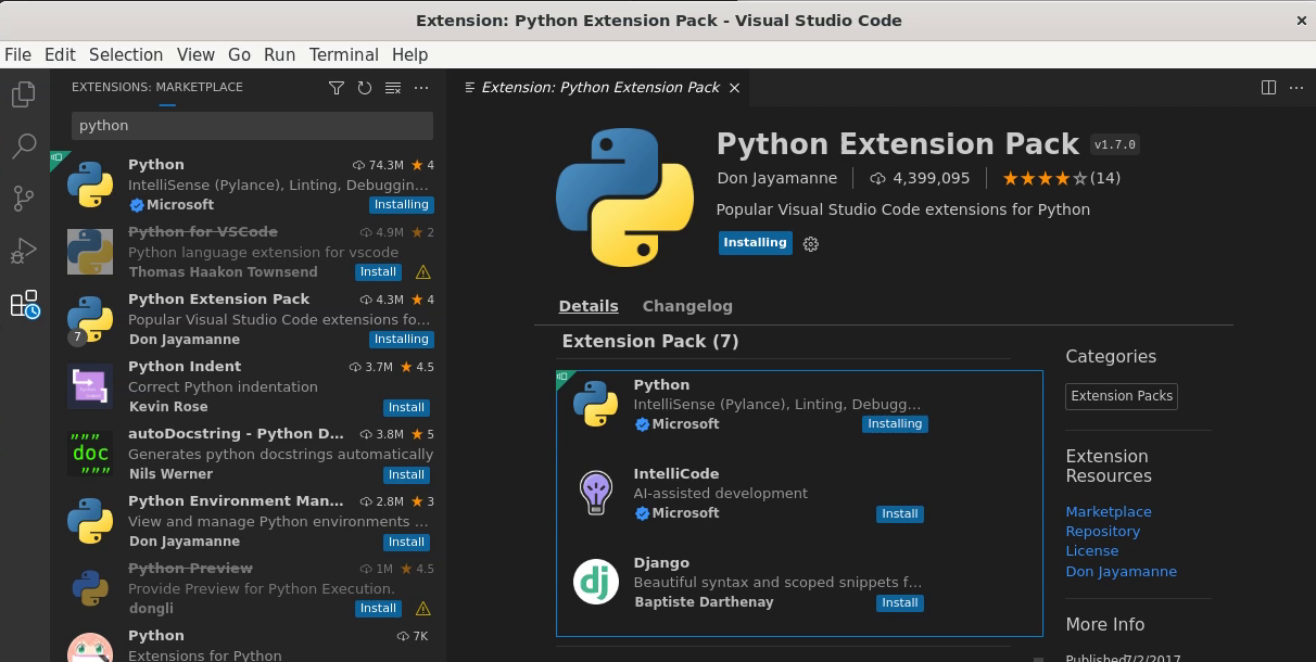 Python Extension Pack에는 7가지 플러그인이 들어있습니다. 해당 플러그인을 설치하면 파이썬 개발환경을 만들기 위한 주요 플러그인을 한 번에 설치할 수 있습니다.