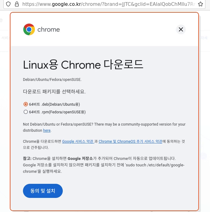 우선은 크롬 설치파일을 받아야 합니다. 크롬 홈페이지에서 우분투 설치 바이너리를 다운로드 받아도 되고 wget으로 설치 파일을 받아도 됩니다.