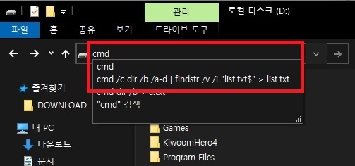 경로창에서 cmd명령을 바로 실행하면 폴더에 어떤 파일이 있는지 리스트를 만들 떄 사용하면 유용합니다.