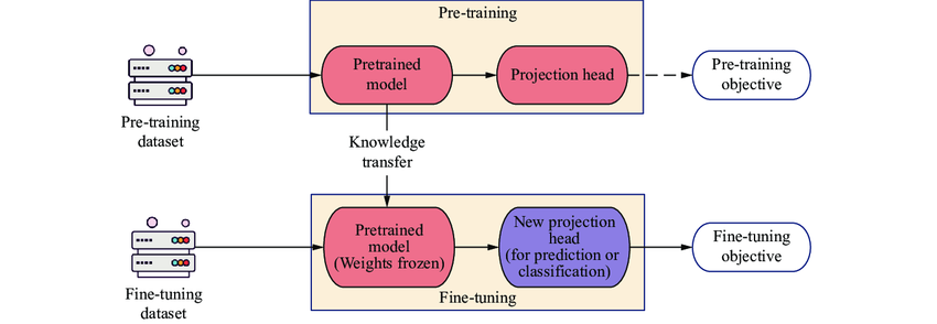 전이 학습 과정은 크게 두 단계, 사전 학습(Pretraining)과 미세 조정(Fine-tuning)으로 구분됩니다.