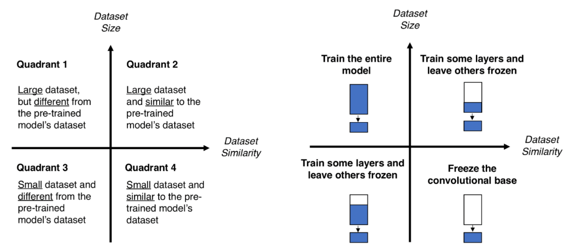 둘째, 사전 학습된 모델의 일부만 재학습 하는 경우 입니다. 이는 지식 전이된 사전 학습 모델의 일부 계층만 재학습 하는 방법 입니다. 이 방법은 데이터의 양과 종류에 따라서 재학습 하는 계층을 선정하여 재학습 합니다.