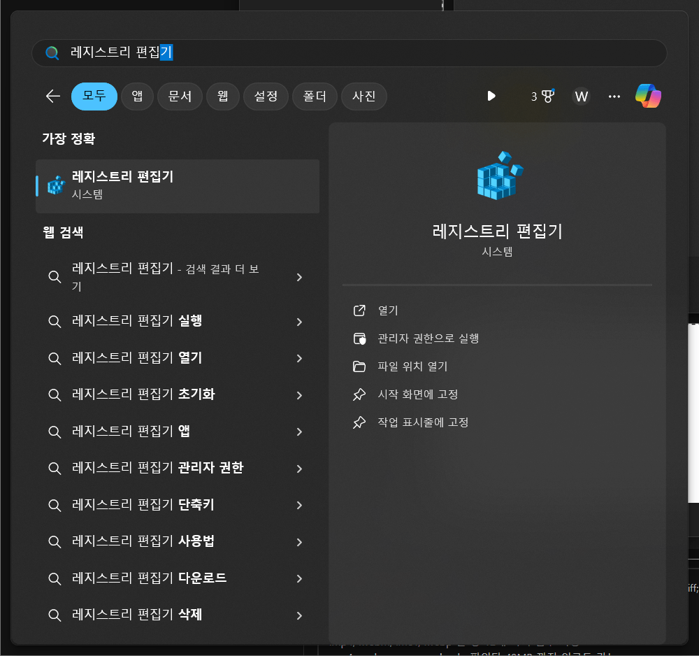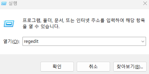 1. 레지스트리 편집기 왼쪽 아래 검색창에서 검색 OR win + R -> regedit 실행