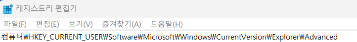 2. HKEY_CURRENT_USER\Software\Microsoft\Windows\CurrentVersion\Explorer\Advanced 경로를 찾기