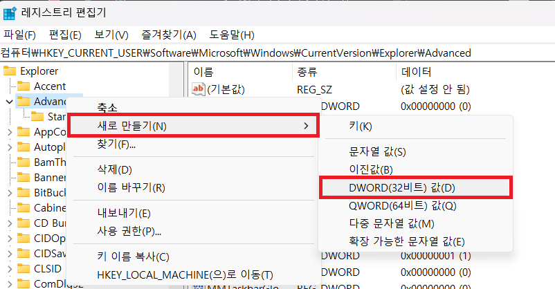3. advanced에서 우클릭하여 새로 만들기 -> DWORD(32비트) 값(D) 클릭
