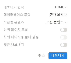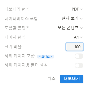 내보내기 형식을 PDF로 해서 저장하면 하단에 페이지 이름과 페이지수가 표시됩니다. 이 표시를 없애기 위해서는 HTML 형식으로 내보낸 뒤 PDF로 저장하는 방법을 사용합니다.