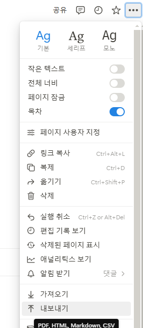 PDF로 저장하고 싶은 페이지로 이동한 후 노션 페이지 우측 상단에 삼점 아이콘을 눌러서 내보내기 (export)를 클릭합니다.
