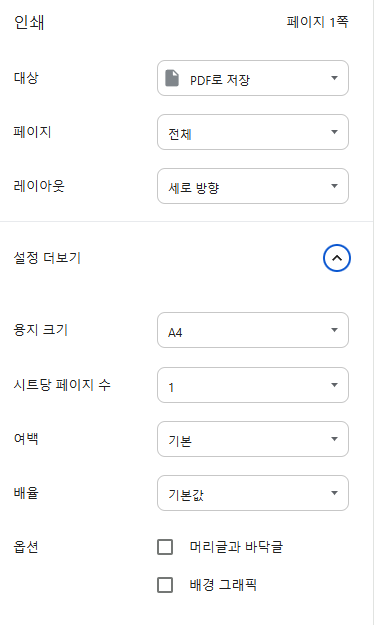저장된 HTML 파일을 열고 출력(Print) 하여 출력 설정창을 띄웁니다. 대상을 PDF로 저장으로 하고 옵션에 머리글과 바닥글의 체크를 해제하면 하단에 페이지 이름과 페이지수가 출력되지 않습니다. 역시 글자가 좀 크다 싶으면 배율을 조정해주면 됩니다.